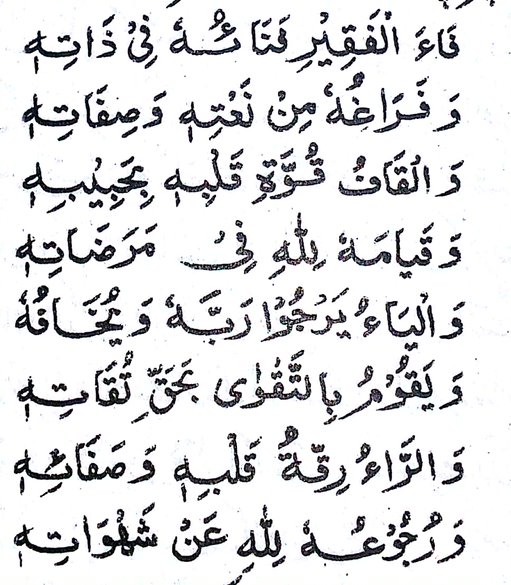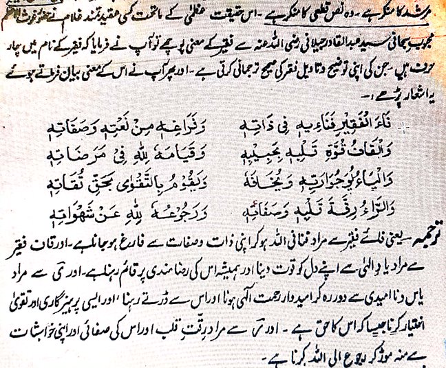 کسی عقیدت مند غلام نے حضور غوث الاعظم محبوب سبحانی سید عبدالقادر جیلانی رضی اللہ عنہ سے ققیر کے معنی پوچھے تو آپ نے فرمایا کی فقیر کے نام میں چار حرف ہیں ۔جن کی اپنی توضیح و تاویل فقیر کی صحیح ترجمانی کرتی ہے